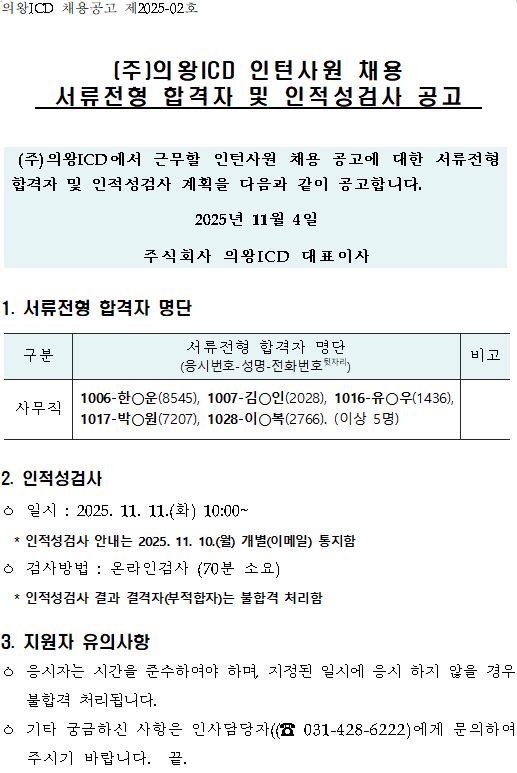 (주)의왕ICD 인턴사원 서류전형 합격자 및 인적성검사 공고